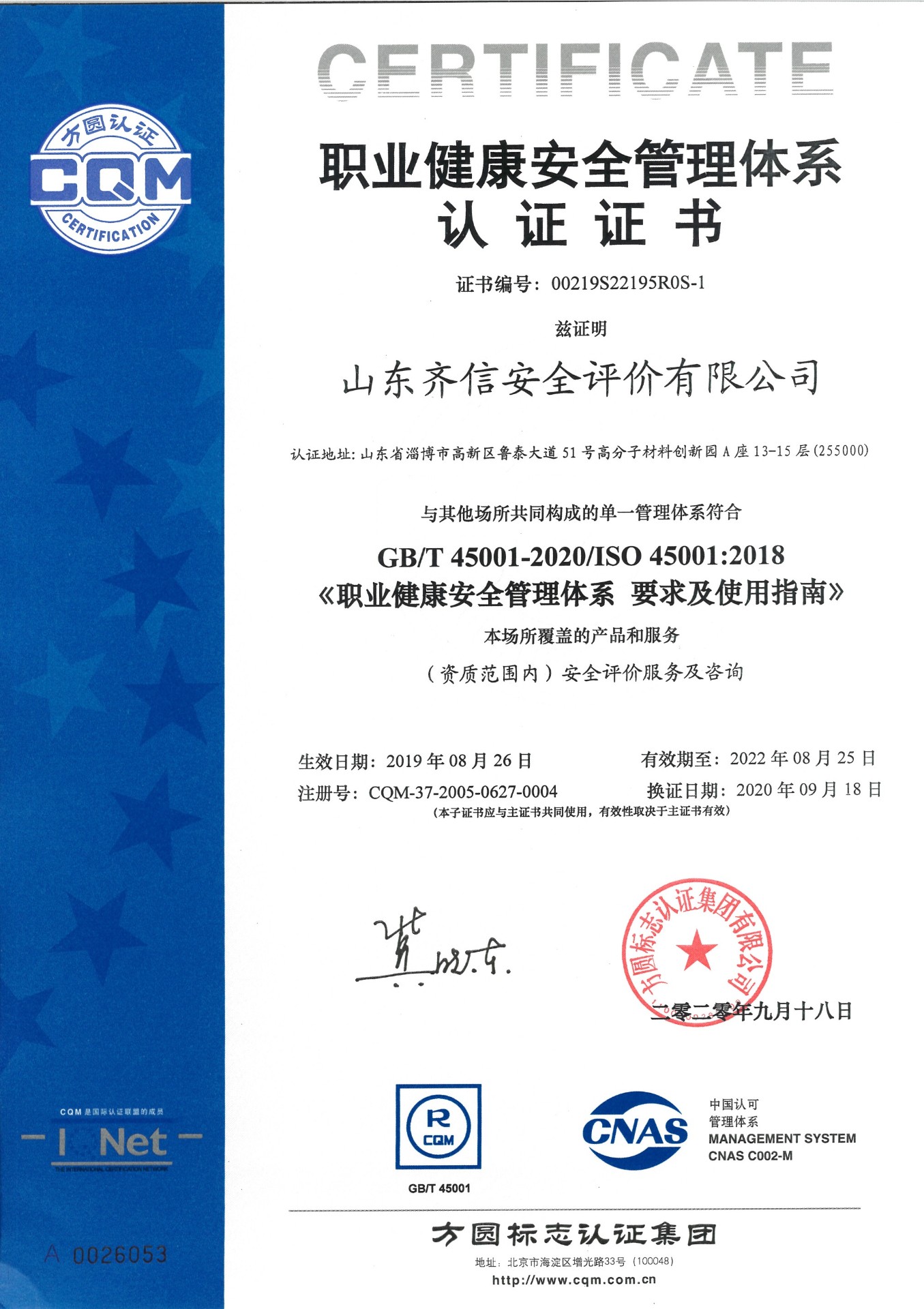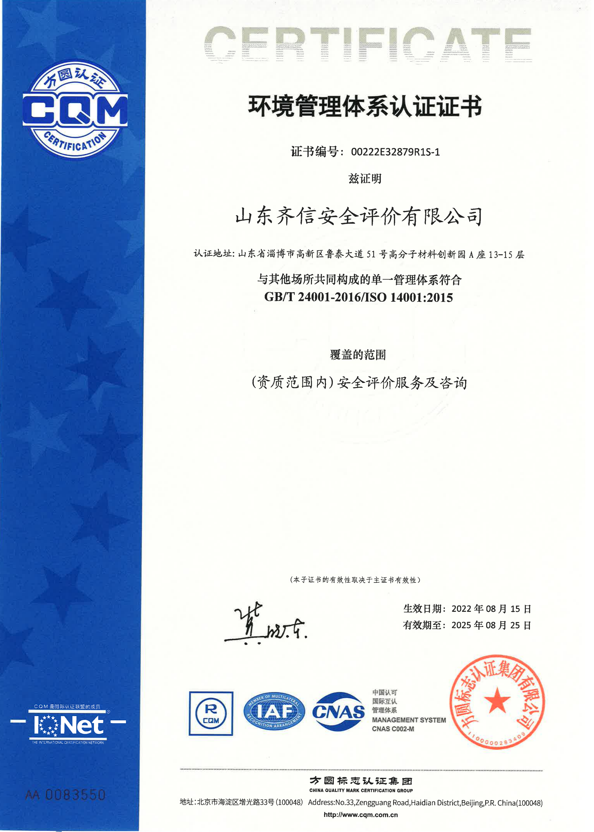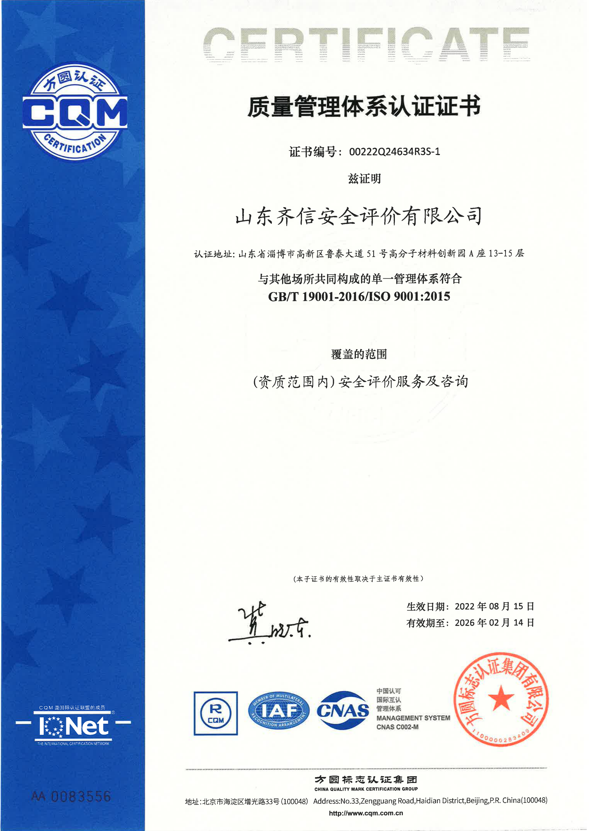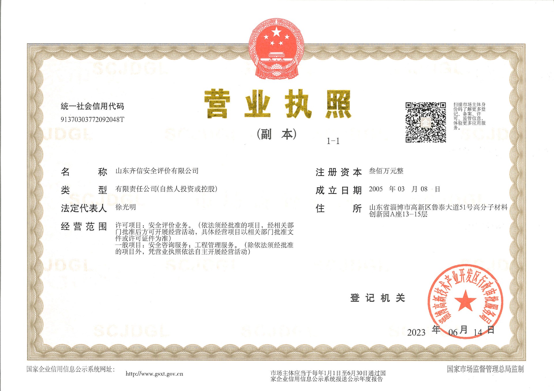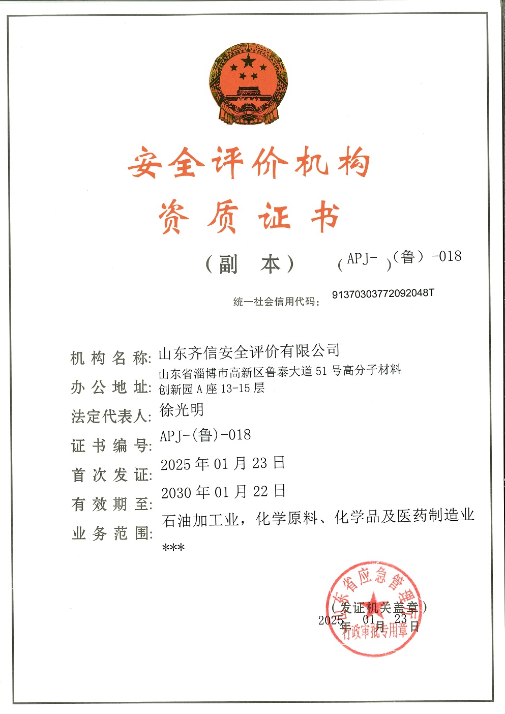 山東齊信安全評價有限公司成立于2005年3月,注冊資本300萬元人民幣,固定資產(chǎn)總值804.8728萬元。法定代表人徐光明,注冊地址及辦公地址位于淄博高新區(qū)魯泰大道51號高分子材料創(chuàng)新園A座13-15樓。2005年9月取得安全評價機構(gòu)乙級資質(zhì)。自國家應(yīng)急部1號令實施以來,公司于2020年1月15日取得新安全評價資質(zhì),業(yè)務(wù)范圍包括:陸上油氣管道運輸業(yè);石油加工業(yè),化學(xué)原料、化學(xué)品及醫(yī)藥制造業(yè);金屬冶煉。2018年12月21日取得安全生產(chǎn)標(biāo)準(zhǔn)化二級評審單位,評審范圍:危險化學(xué)品、紡織、建材、輕工、冶金、機械。 公司現(xiàn)有人員41人,其中專職安全評價師37人,注冊安全工程師26人,研究員1人、碩士5人、雙學(xué)士1人,山東省安全專家?guī)鞂<?人、教授級高工1人,高級工程師8人、工程師22人,專職危險化學(xué)品標(biāo)準(zhǔn)化評審員、工商貿(mào)標(biāo)準(zhǔn)化評審員30人,本科以上學(xué)